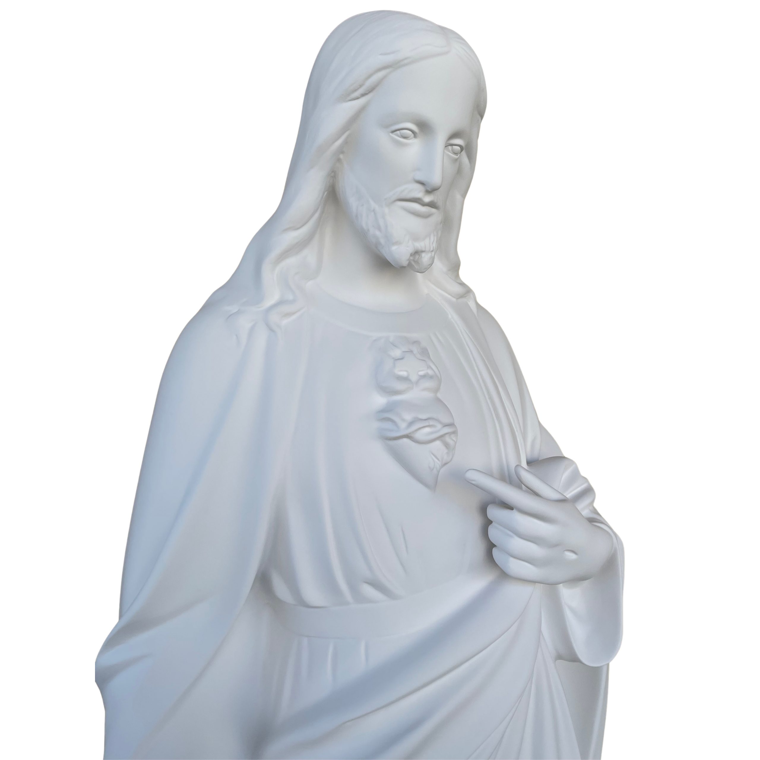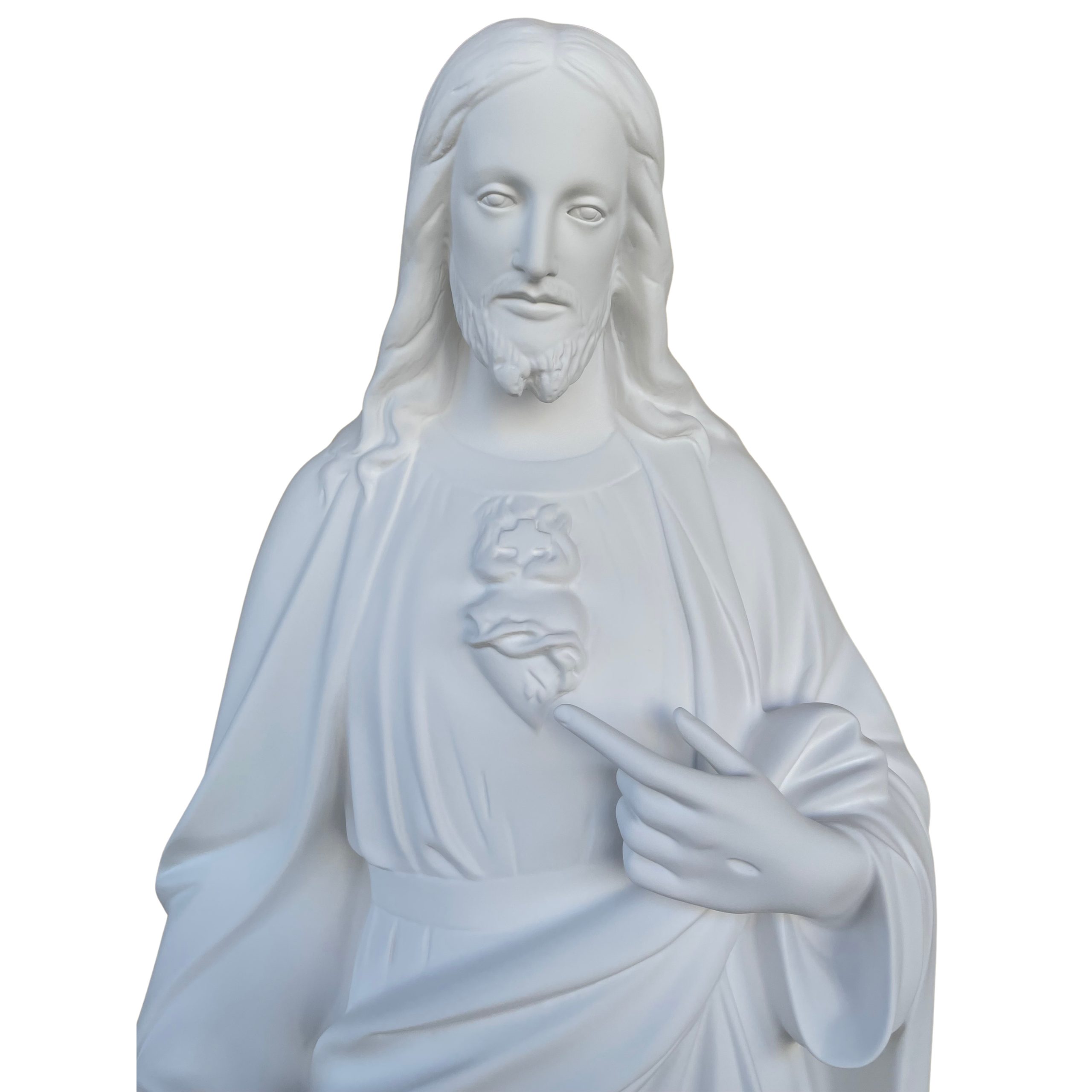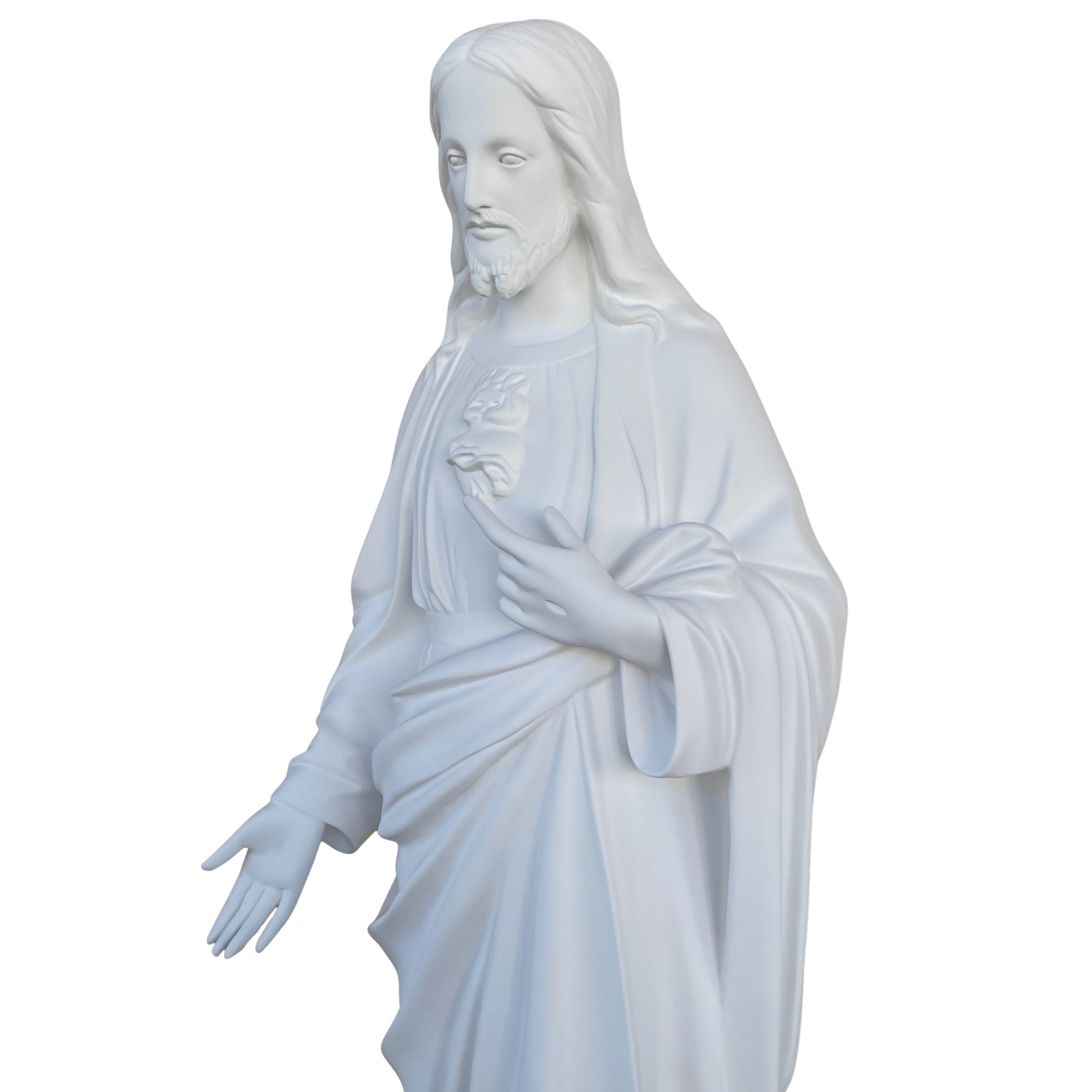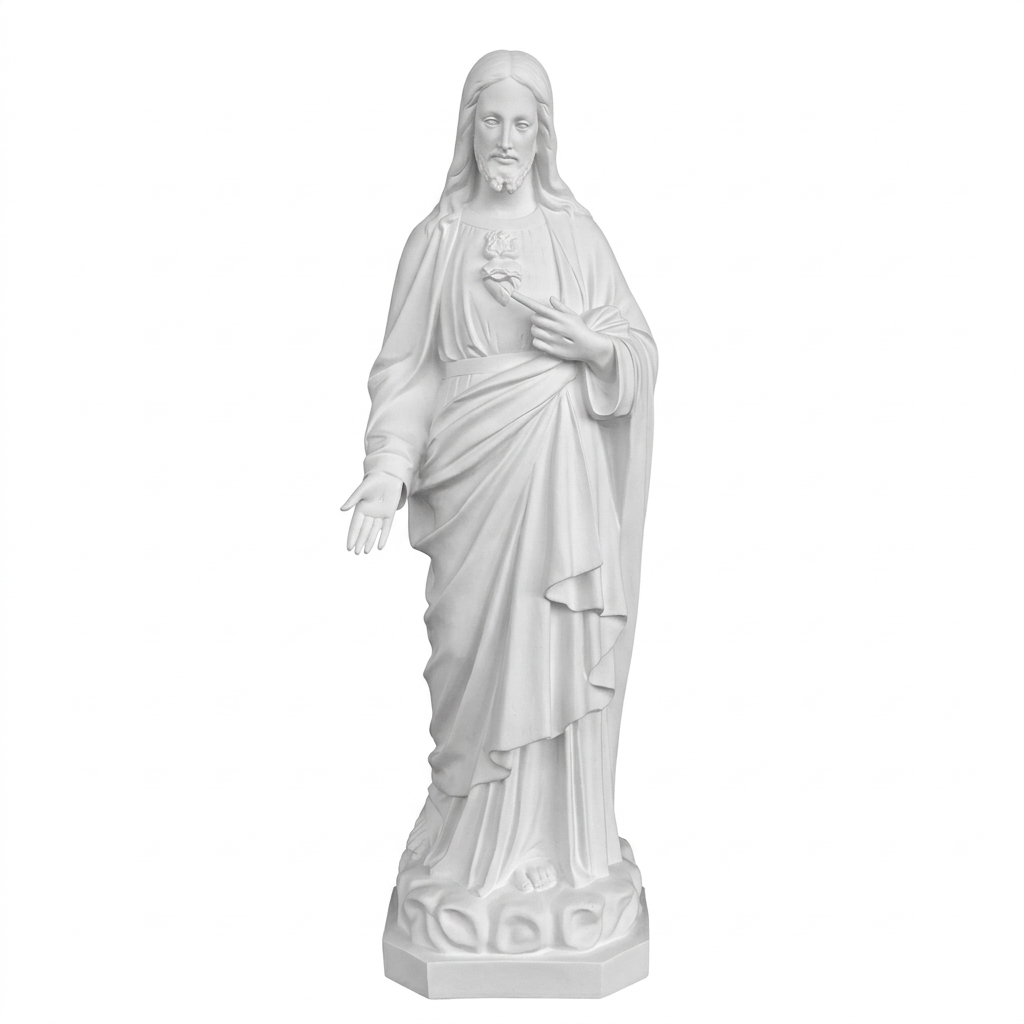 La statua del Sacro Cuore di Gesù da 130 cm, con finitura bianca per esterno, è realizzata in vetroresina, tramite una lavorazione totalmente artigianale e dipinta interamente a mano con colori classici da abili artigiani qualificati.